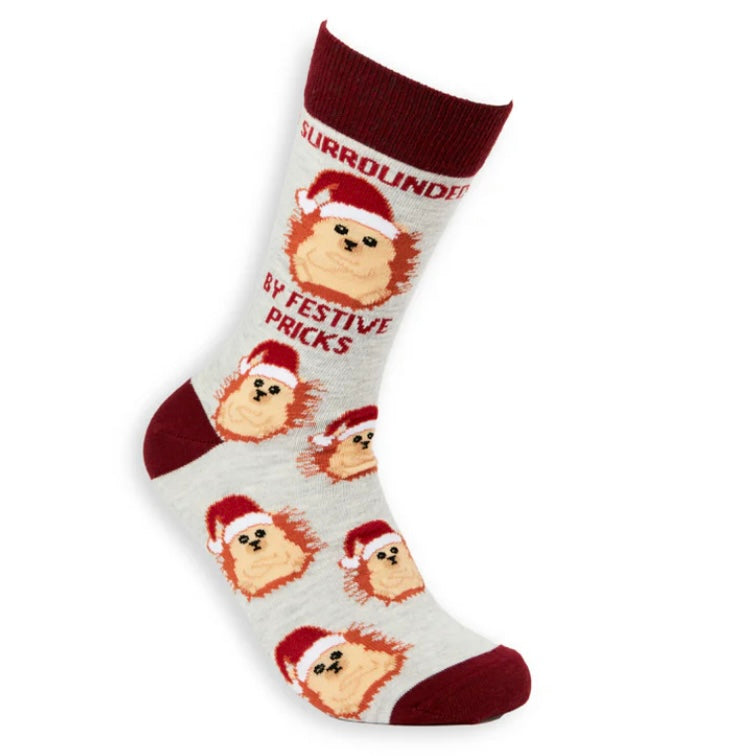 Add a dose of cheeky holiday humor to your festive wardrobe with the Surrounded by Xmas Pricks Socks! These quirky socks feature a fun, festive twist with prickly designs, perfect for adding a humorous touch to your Christmas season. Made from soft, cotton-rich fabric, these socks offer comfort and a playful statement for anyone with a mischievous holiday spirit. Whether as a fun gift or for your own collection, these socks are sure to bring laughter and warmth to your festive outfits. Explore more unique holiday designs in our full collection online!Fits Mens and Ladies Sizes UK - 6 - 11