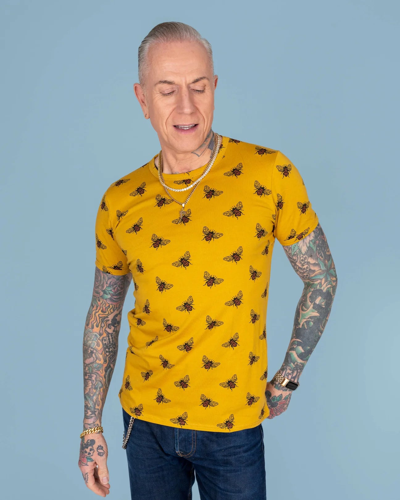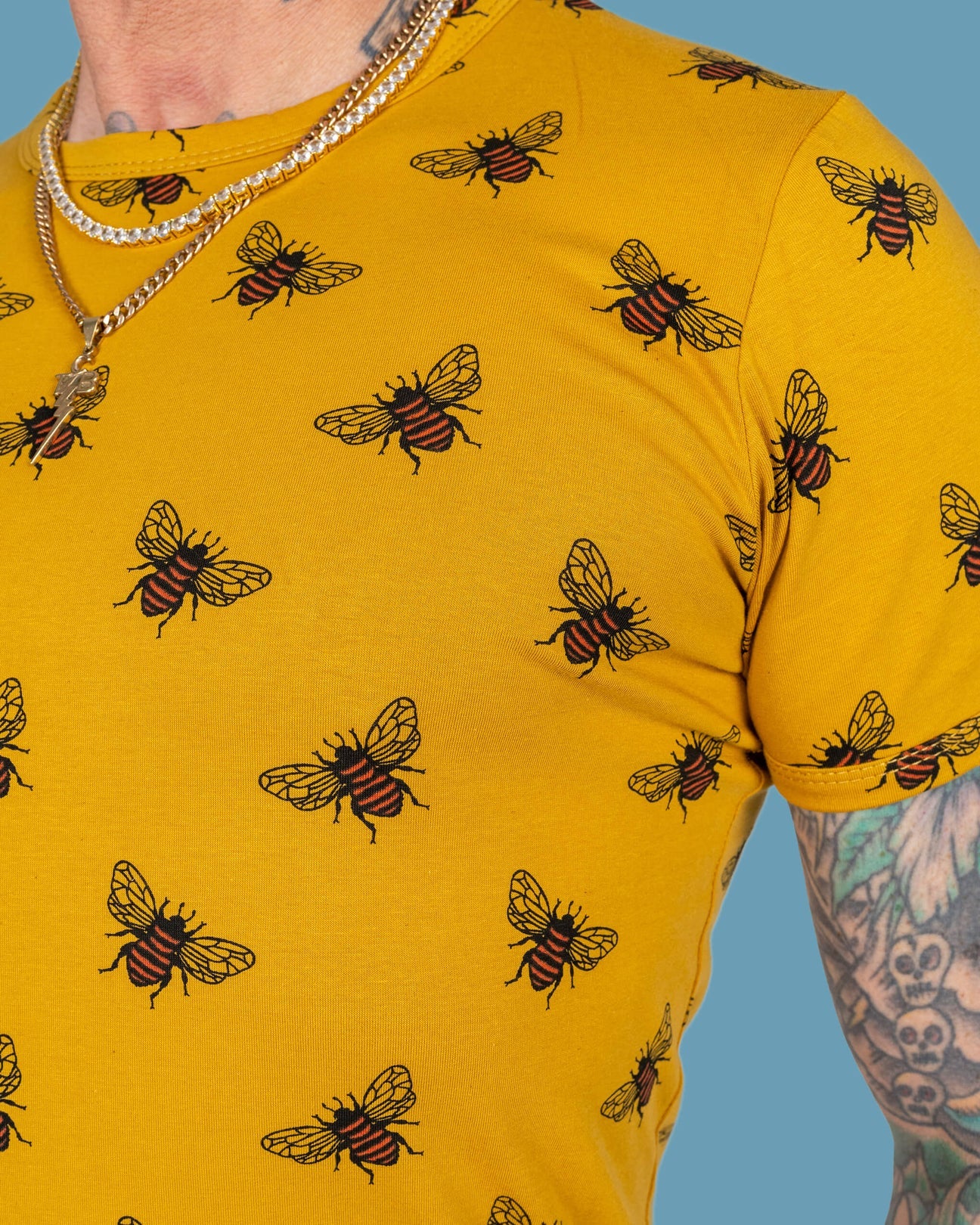 Be(e) your boldest self in this buzzing beauty! A print of adorable bees on a vibrant mustard yellow background. Made from super-soft stretch cotton, this tee is as kind to the planet as it is to your wardrobe. Perfect for picnics, park strolls, or just chilling on the sofa. Style it with your favourite denim for a relaxed vibe that’s the bee’s knees!