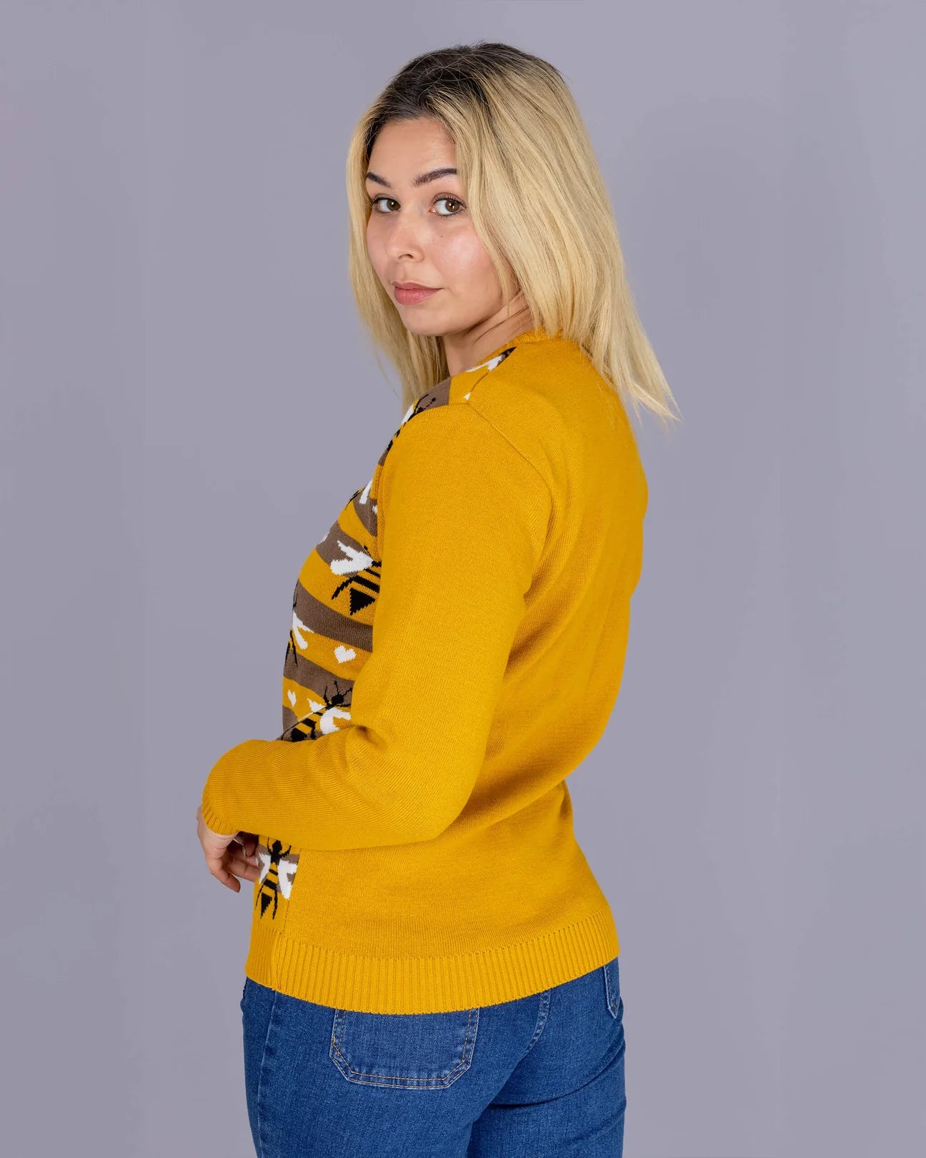Bee the Cutest! š Mustard Gold BeeĀ Jumper with Stripe and Heart Print. 100% Acrylic Medium Weight Mustard GoldĀ Jumper.