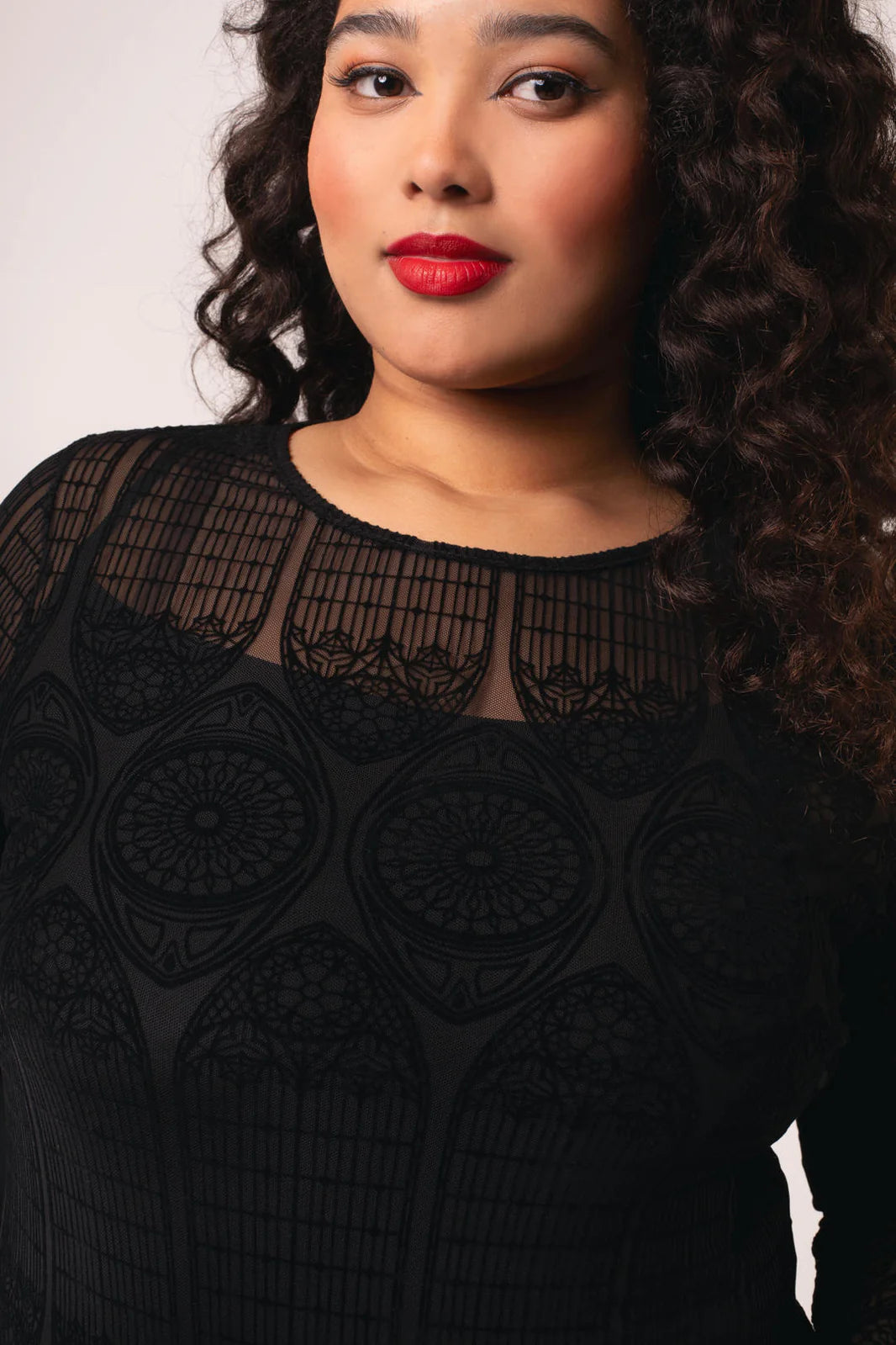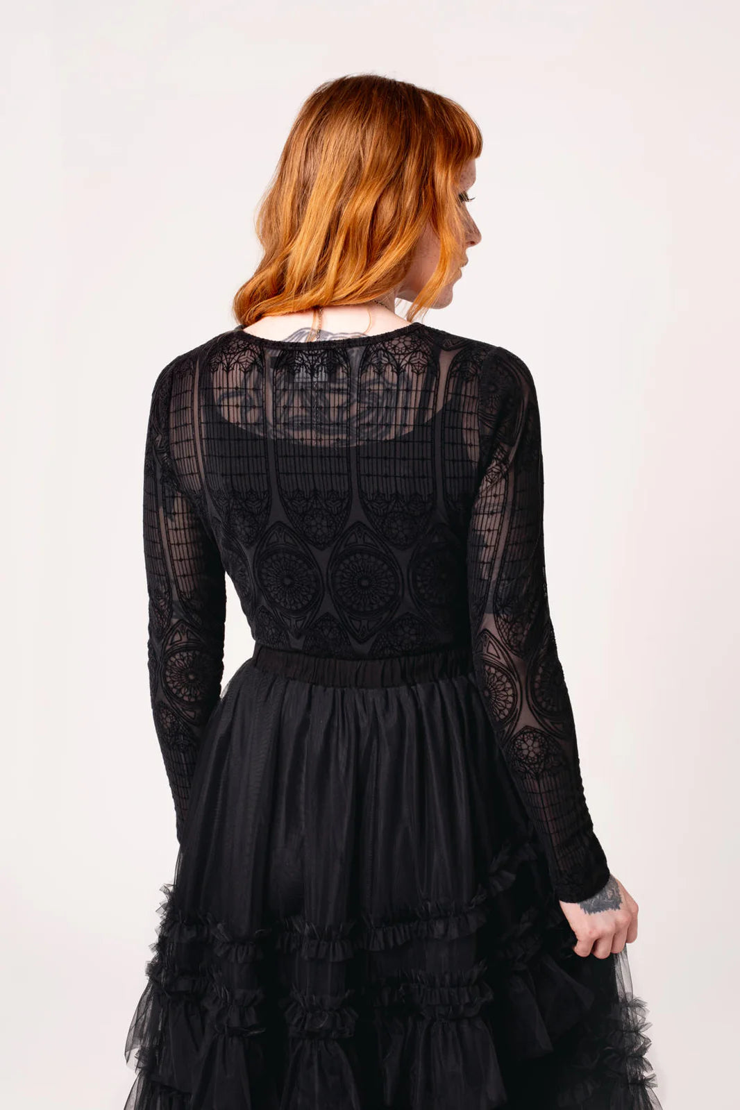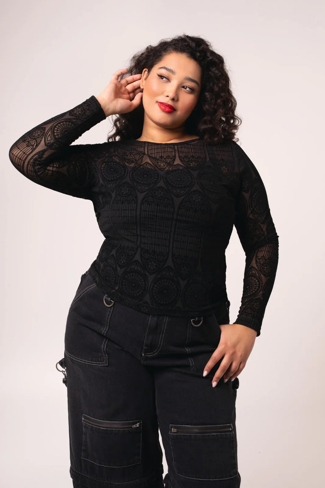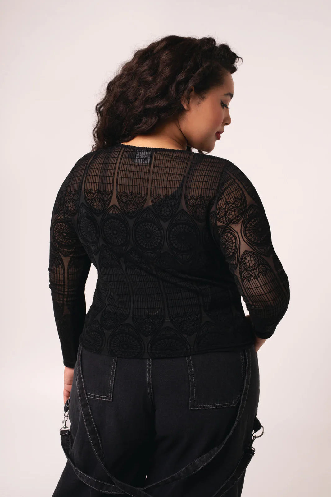 Stained glass, candlelight, and The Mea Culpa Top. This statement black, stretch mesh top is etched with intricate velvet flocking, reminiscent of gothic architecture. With full-length sleeves and a hem that finishes at the hips, you’ll know you’re covered for any adventure. Style with The Prudence Skirt pictured for textural layering, or pair it with The Simone Trousers for an effortless, all-black ensemble.