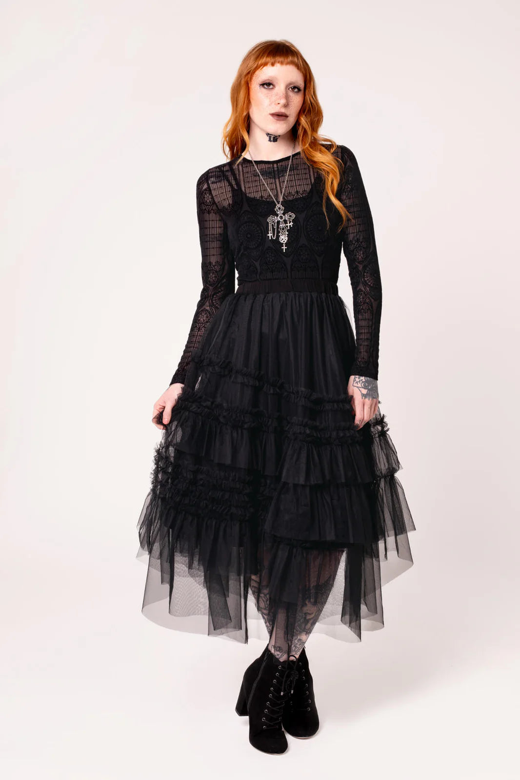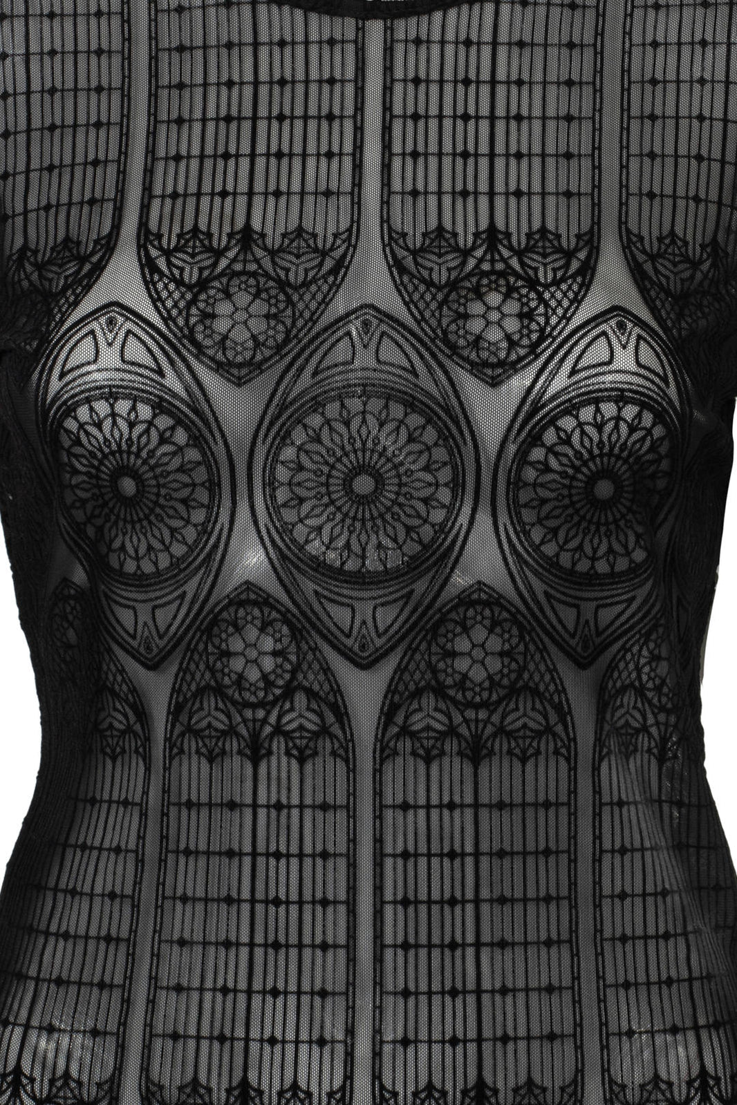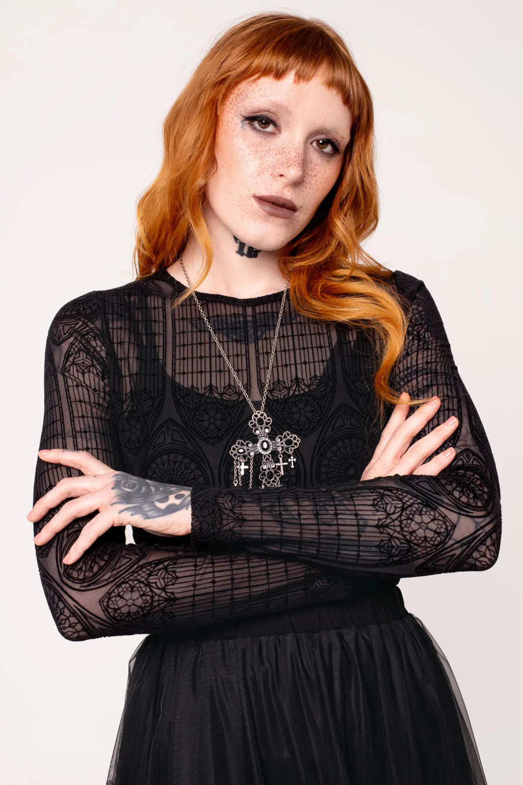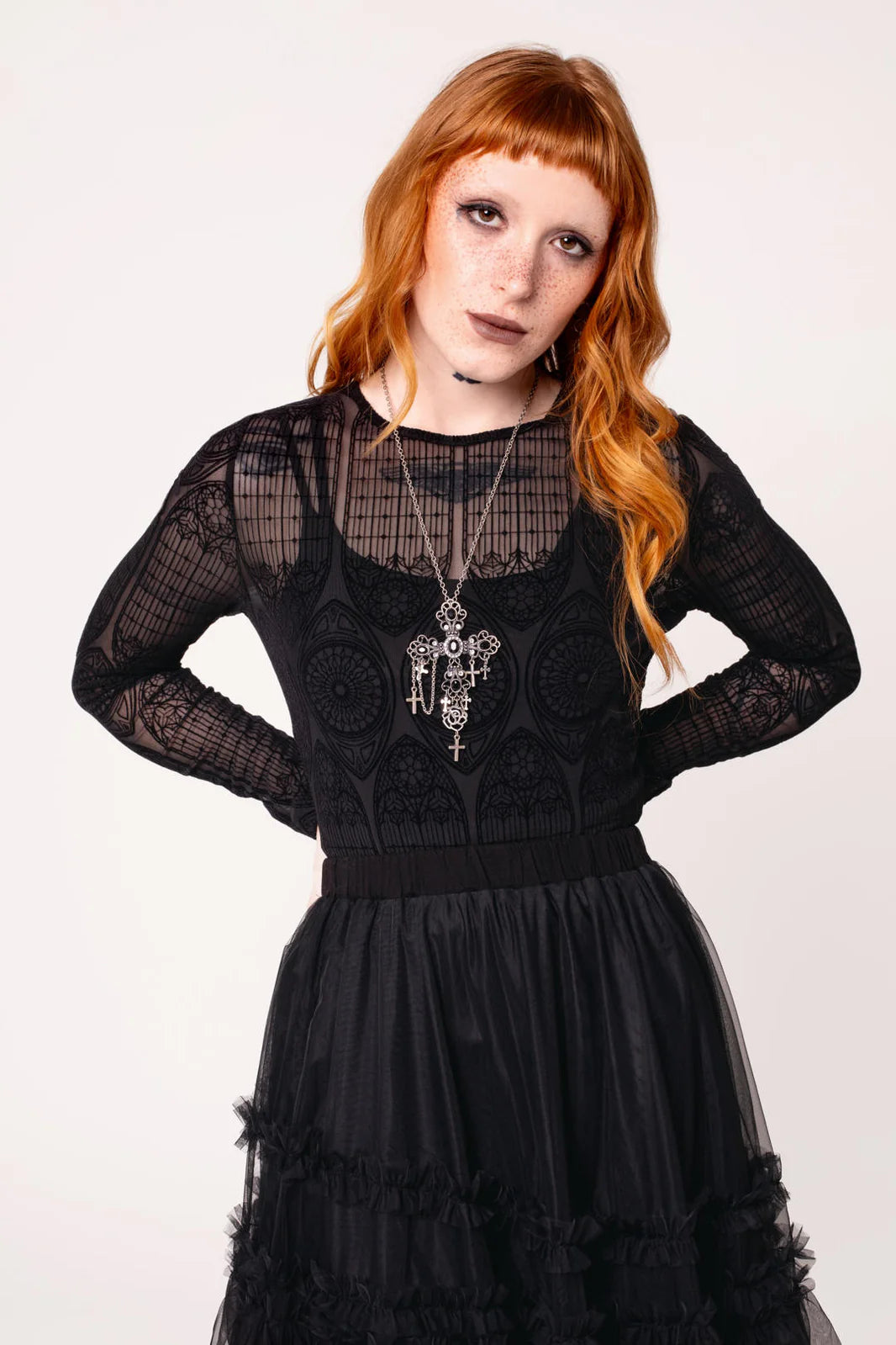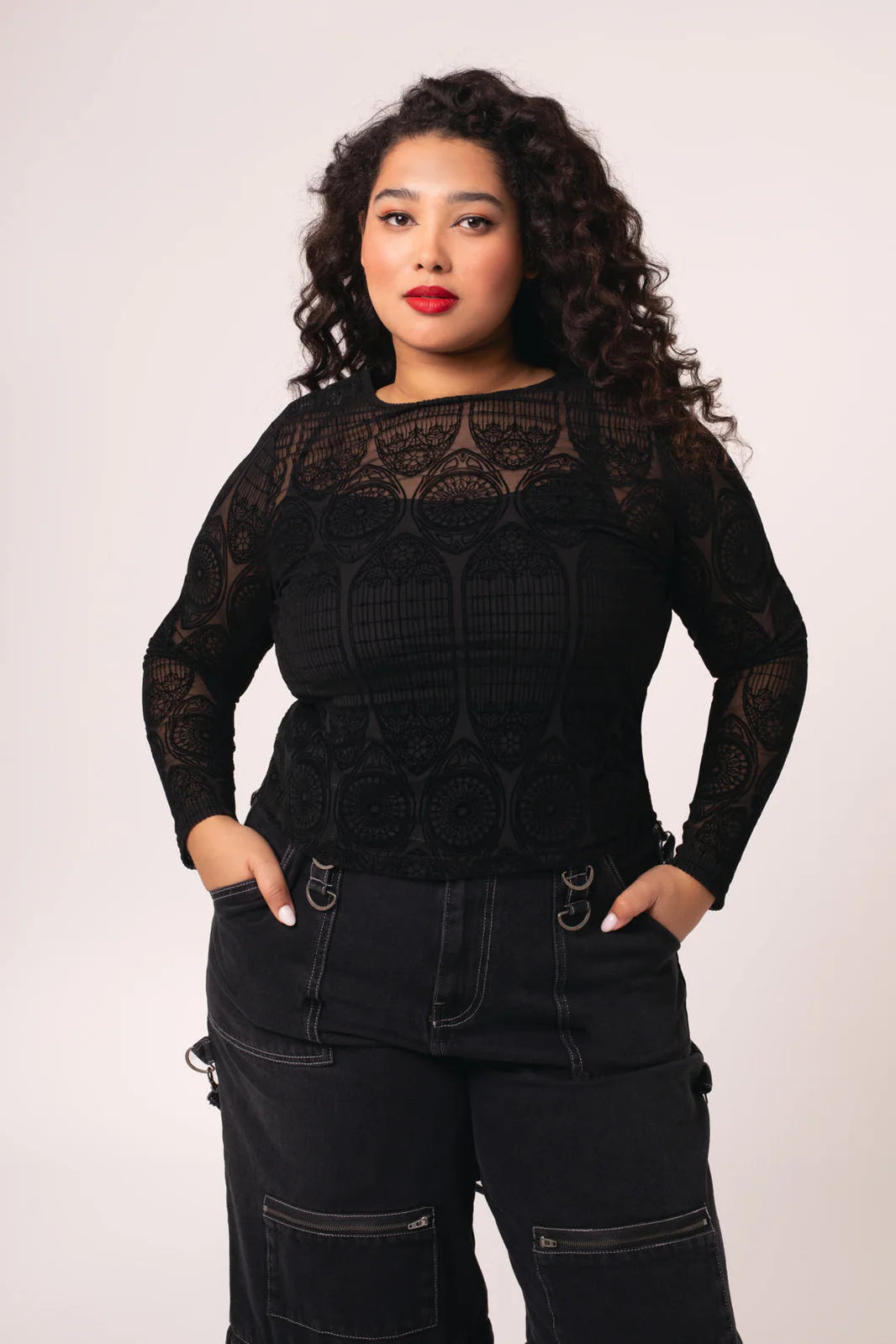 Stained glass, candlelight, and The Mea Culpa Top. This statement black, stretch mesh top is etched with intricate velvet flocking, reminiscent of gothic architecture. With full-length sleeves and a hem that finishes at the hips, you’ll know you’re covered for any adventure. Style with The Prudence Skirt pictured for textural layering, or pair it with The Simone Trousers for an effortless, all-black ensemble.