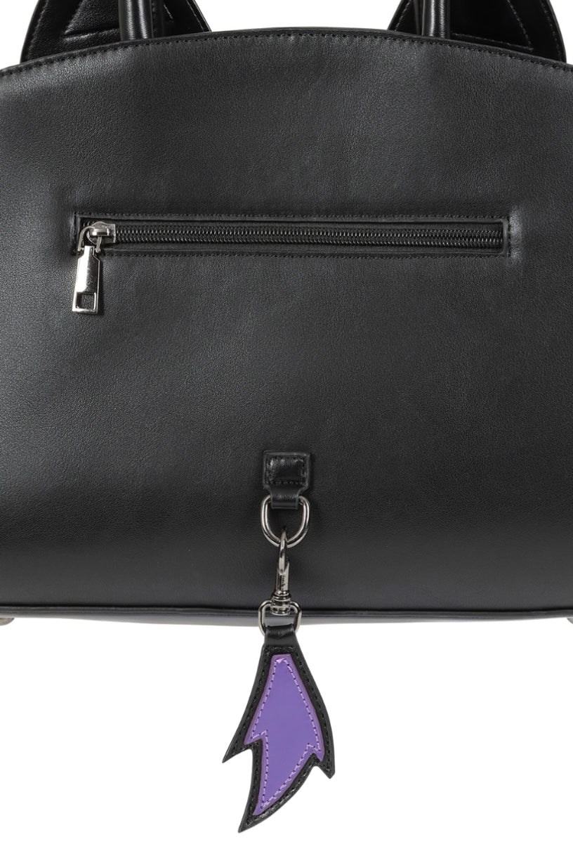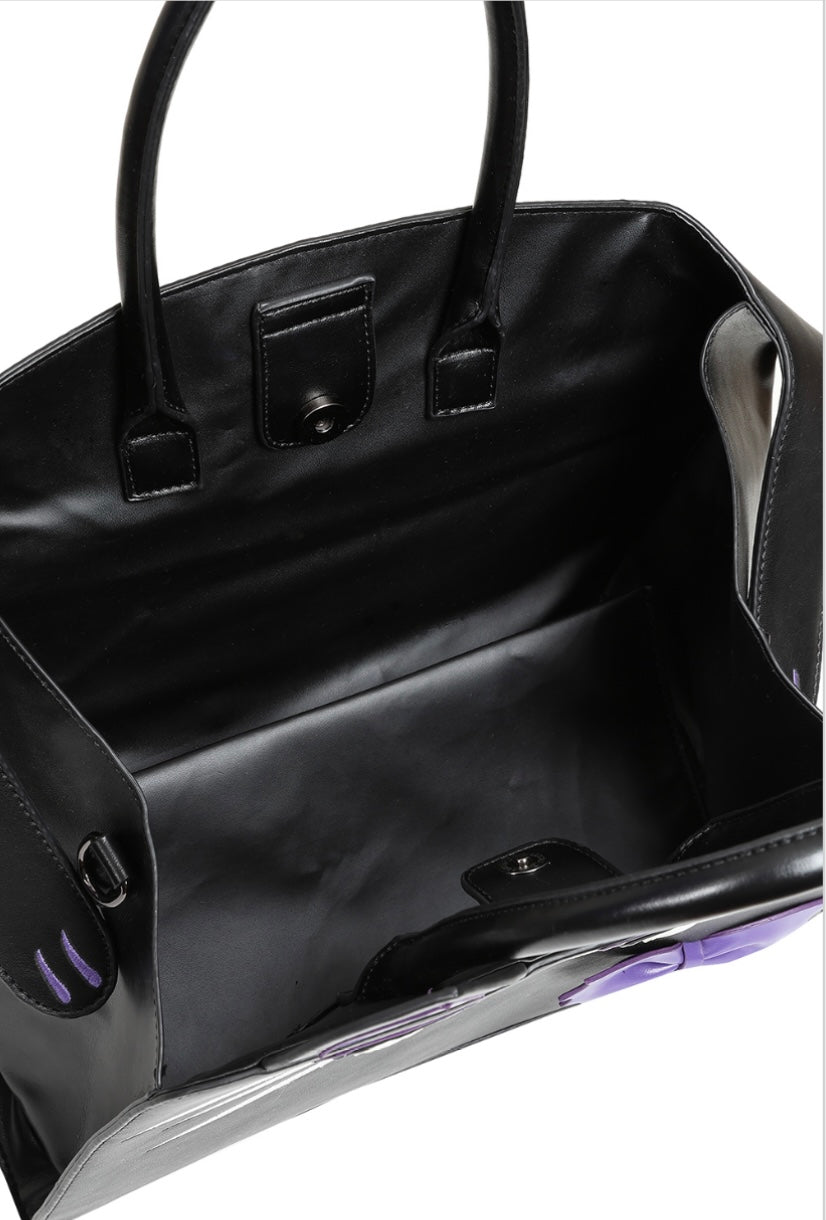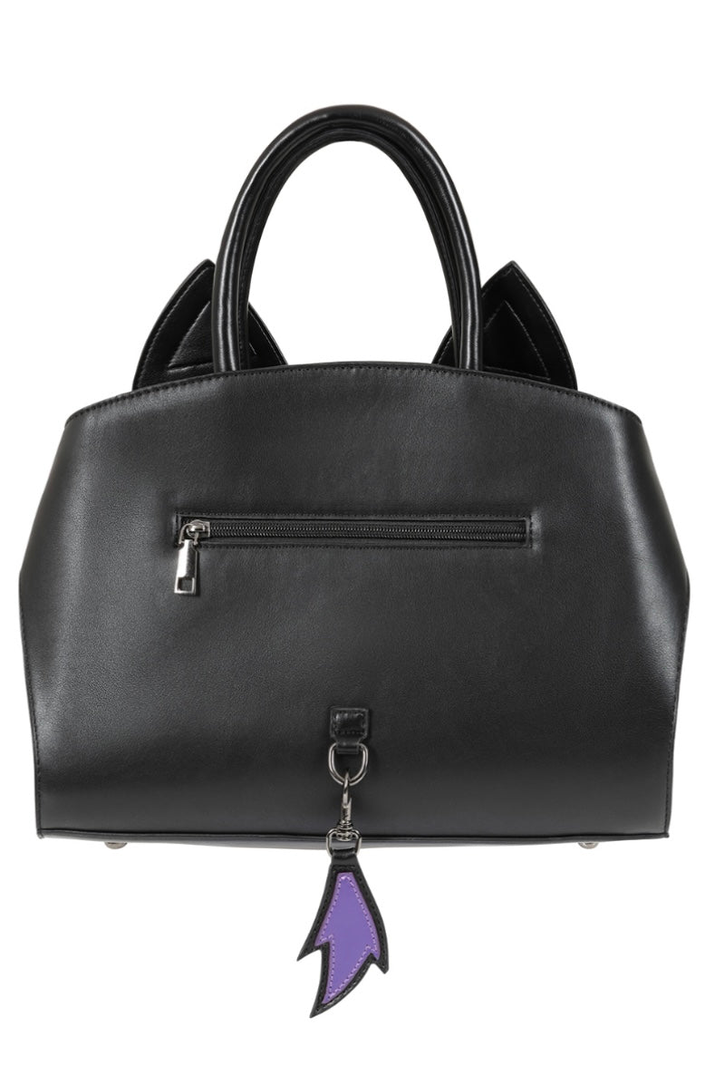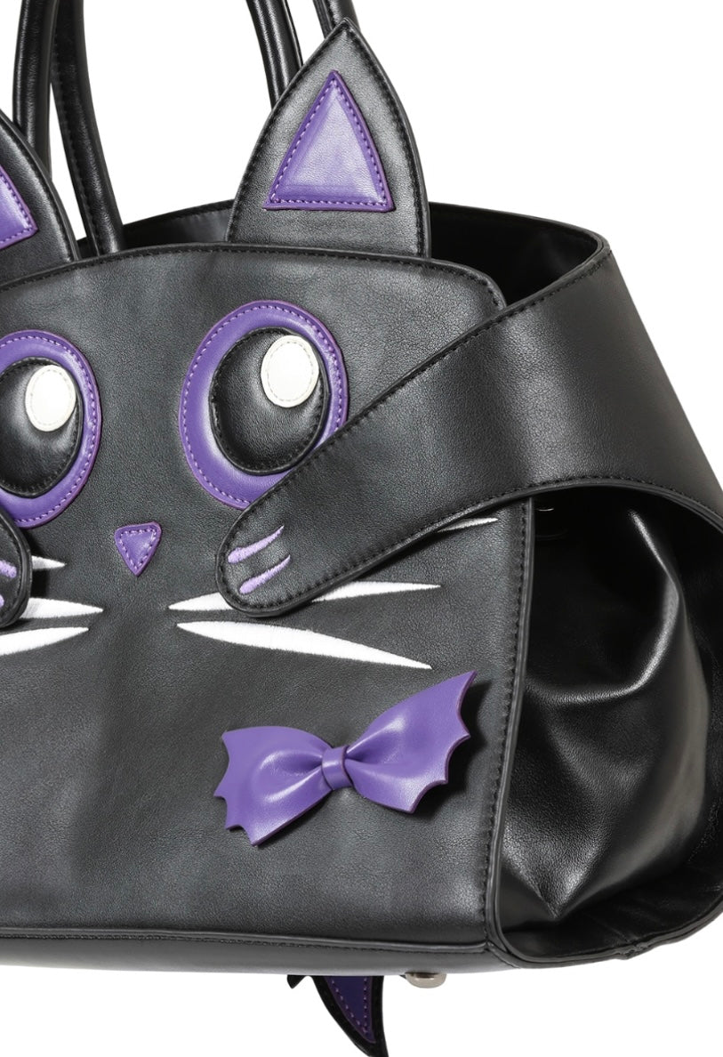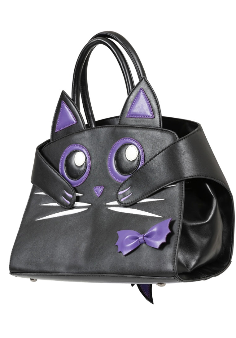 Level up your alt fashion with Banned's structured cat handbag featuring mystical purple accents and bat details. Includes detachable shoulder strap for versatile styling. Perfect kawaii-goth statement piece.