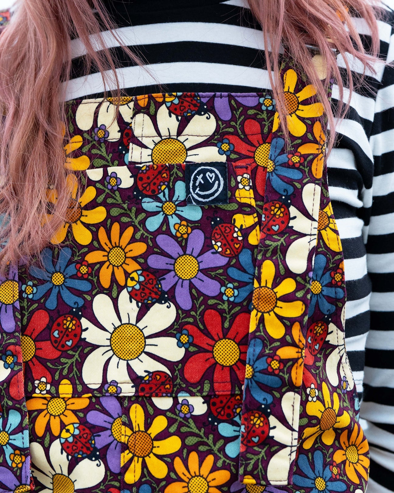 Meet your new joy boosters. Our Love Bug Dungarees are bursting with retro flowers bright colours and the sweetest little ladybirds ever ๐๐ผ Designed by the amazing Jen James Design this print is pure serotonin for your wardrobe. If you love dopamine dressing you just found your next obsession.